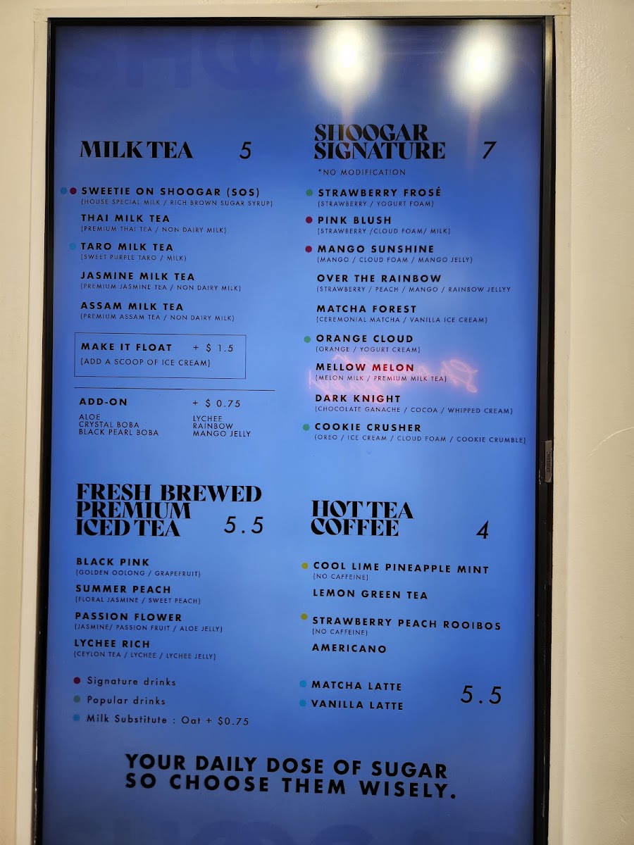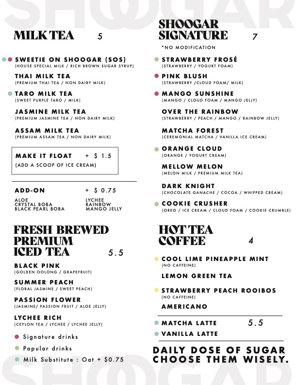 The menu at SHOOGAR TEA SHOPPE reflects a simple yet thoughtfully crafted collection of bubble tea and soothing beverages, designed to complement its inviting and cozy atmosphere. You’ll find comforting drinks like jasmine and taro milk teas alongside fresh brewed ice teas and creamy matcha lattes that suit any time of day—whether as a refreshing afternoon pick-me-up or a calm moment to unwind.